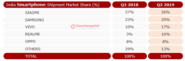 Mint az a fenti táblázatból kiderül, 2018-as Q3-as értékekhez viszonyítva a Xiaomi megőrizte a piaci részesedését az okostelefon piacában az országban. Oké, csökkent 1%-nyit, viszont az leírható, hogy egy év alatt nem változott a helyet: minden negyedik indiai mellettük teszi le a voksát, ha smartphone-t akar vásárolni. A Samsung lecsúszottként a dobogó második helyét foglalja el, míg a Vivo a harmadikat. Igen ám, de ha a pozíciótól eltekintünk, és szemügyre vesszük a változásokat, akkor már aggodalomra van oka a vállalatnak.