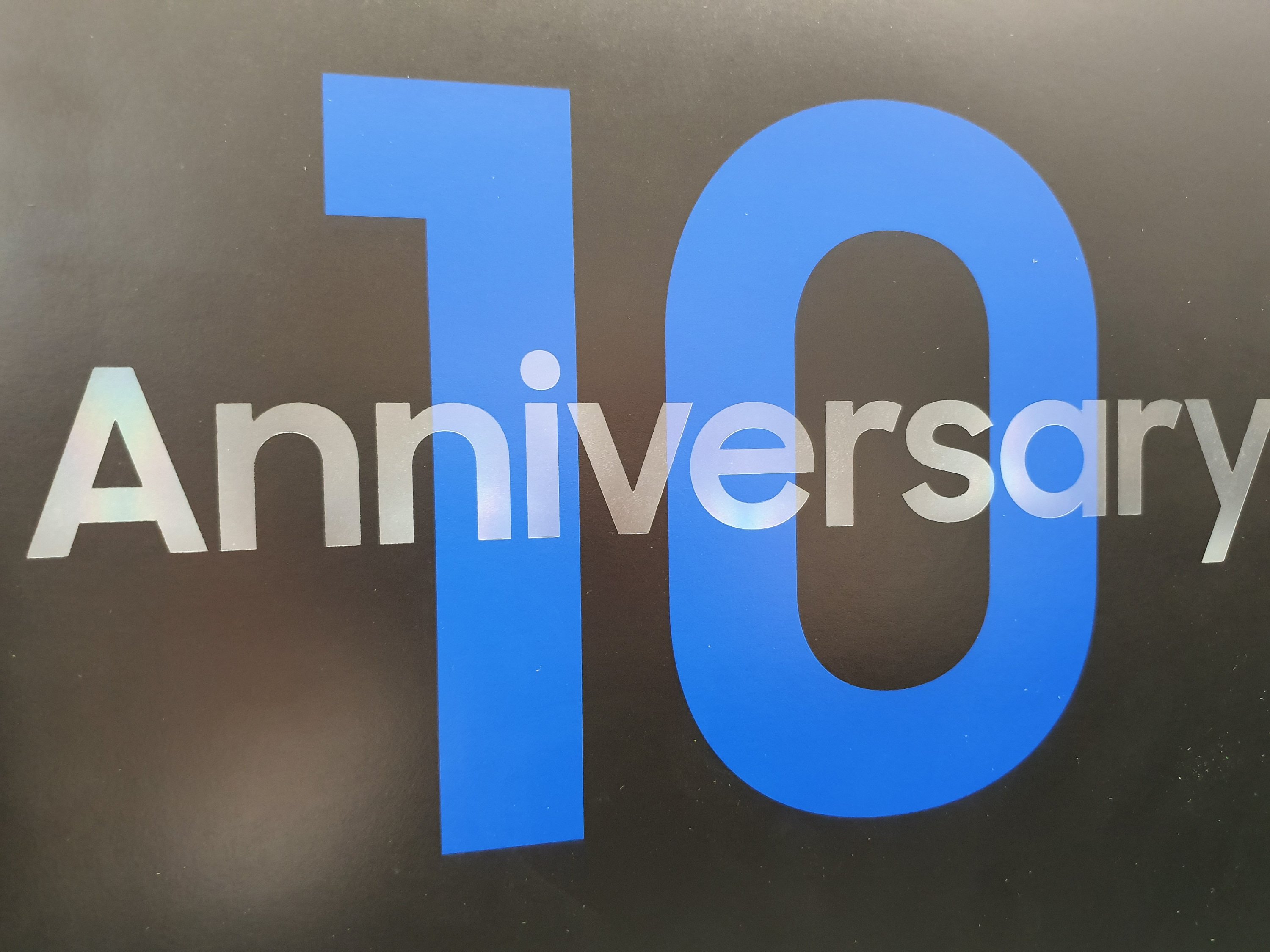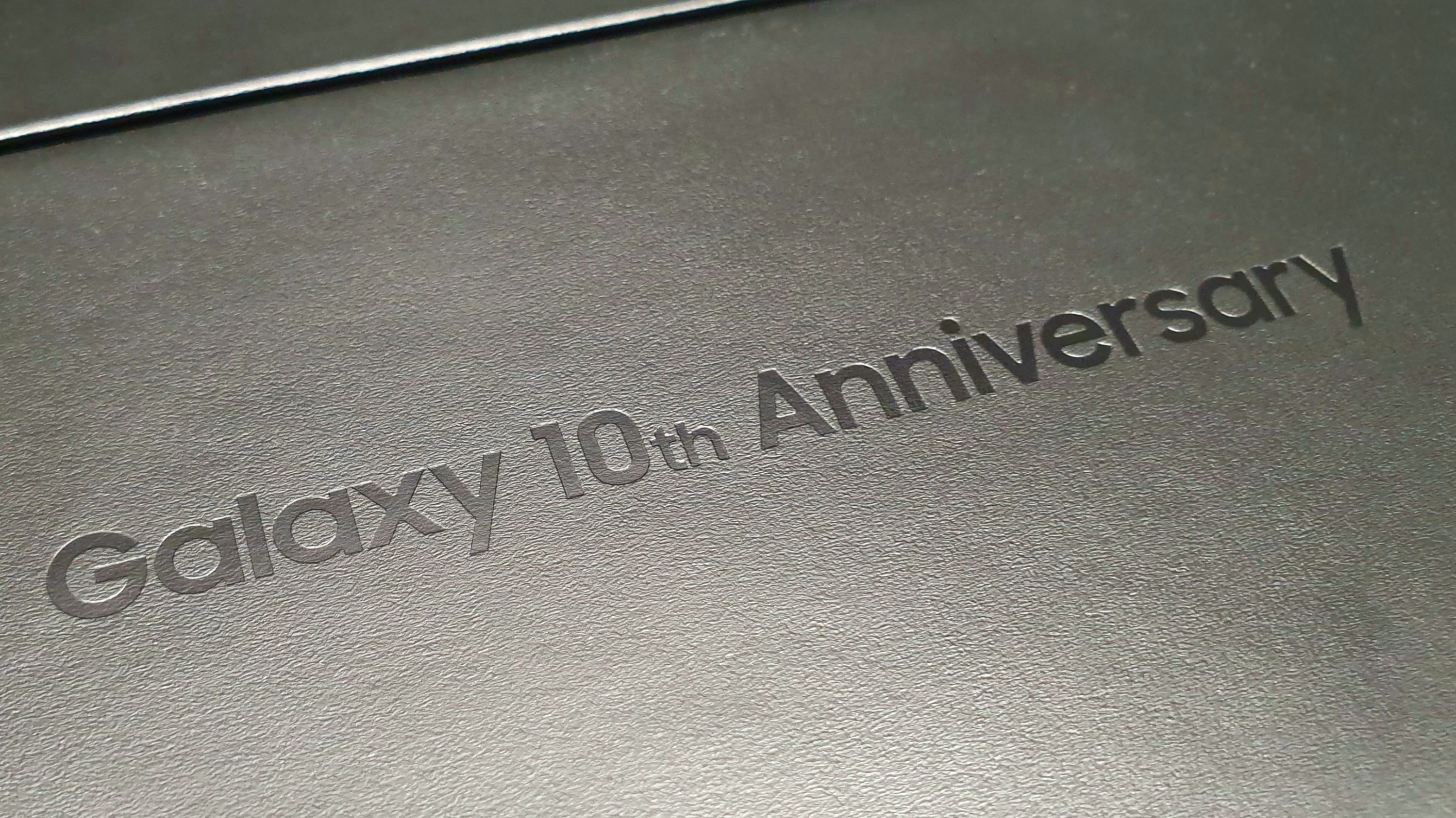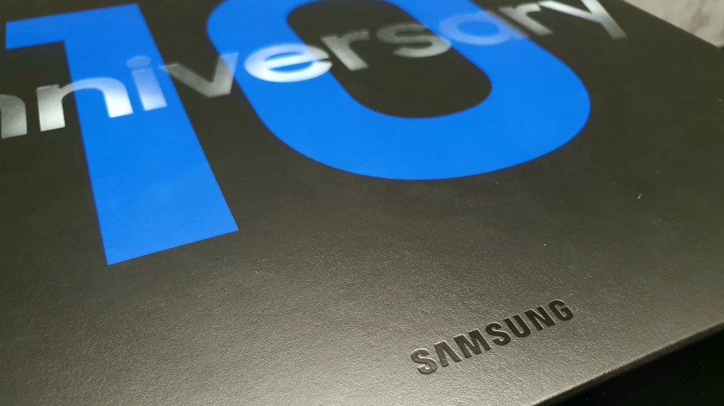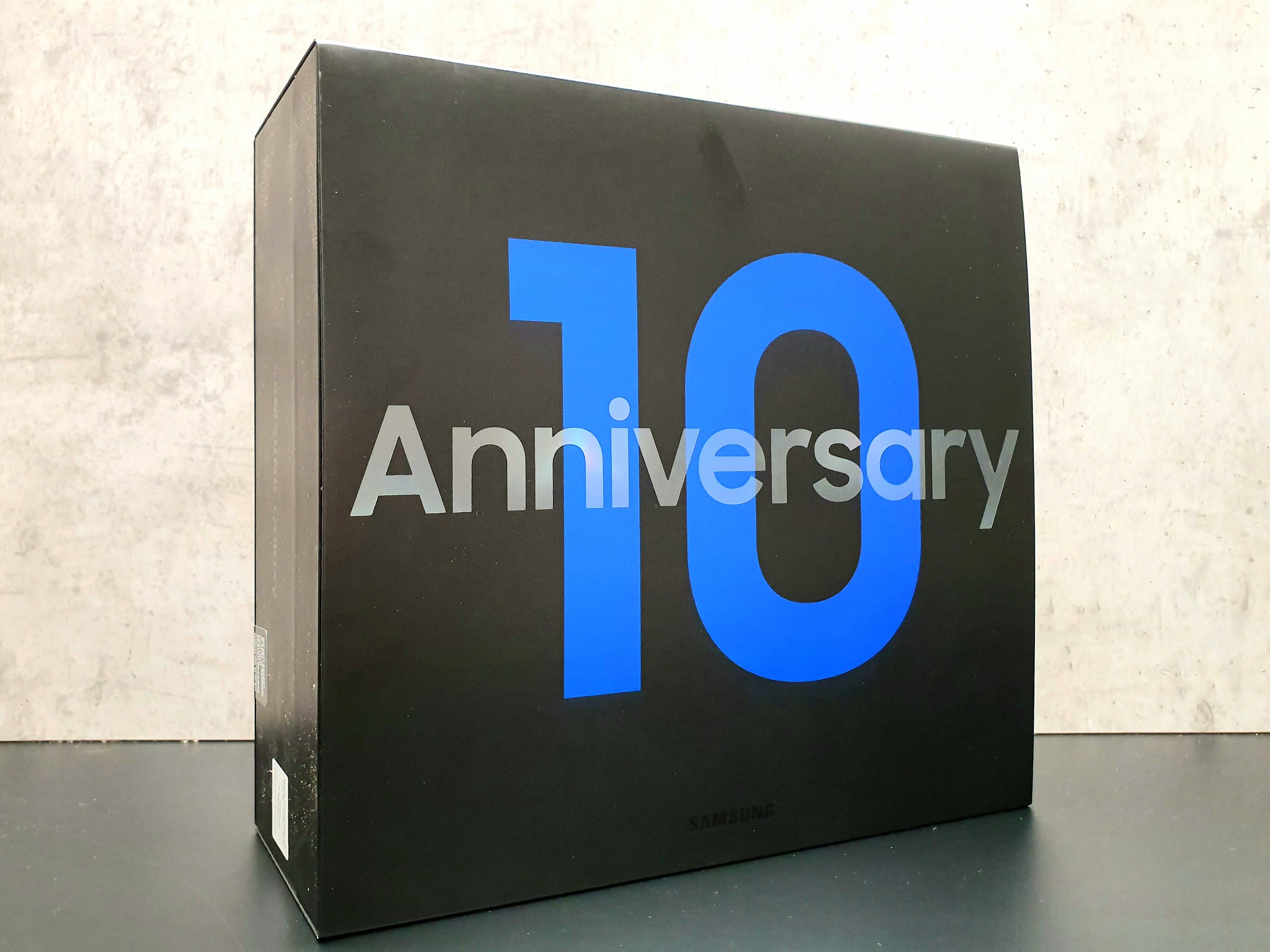 A doboz tetejére a “10 Anniversary” felirat került, ahol a tizes szám a megszokott Samsung királykék színnel került felírásra. Két oldalán dobornyomással a “Samsung Galaxy” és a “Galaxy 10th Anniversary” írás olvasható – amelyek megint csak prémium érzést keltenek.