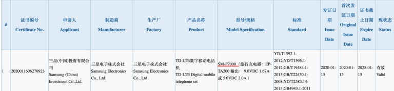 Ez utóbbi már úgy fest: beigazoldódott, ugyanis a kínai 3C névre hallgató szabványozó felület bejegyzésében az olvasható, hogy az SM-F7000 modellszámon futó készülék dobozában az EP-TA200 adapter található, ami hivatalosan a Samsung szimpla type-c végű gyorstöltője, amit a hazai márkaboltokban 6 990Ft-ért árulnak.