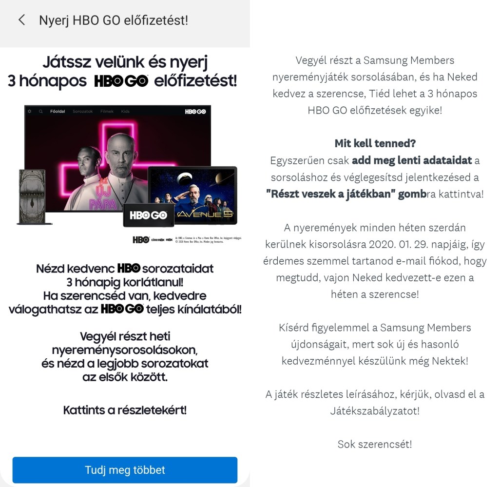 Már kezdtem meglepődni, hogy a hosszabb karácsonyi nyereményjáték sorozat után mekkora kihagyás van a Samsung Members applikációban, aztán teljesen véletlenül beléptem és vettem észre, hogy újfent harcba lehet szállni valamiért. A tét nem más, mint HBO GO streaming szolgáltatós előfizetés, amivel anno a novembert zárták, illetve a decembert nyitották. Nekem speciel még tart az akkor nyert három hónapos ingyenes időszakom, ami a próbahónap mellé csapódott, így igazából négy hónappal lepett meg a Samsung, amit ezúton is nagyon szépen köszönök.