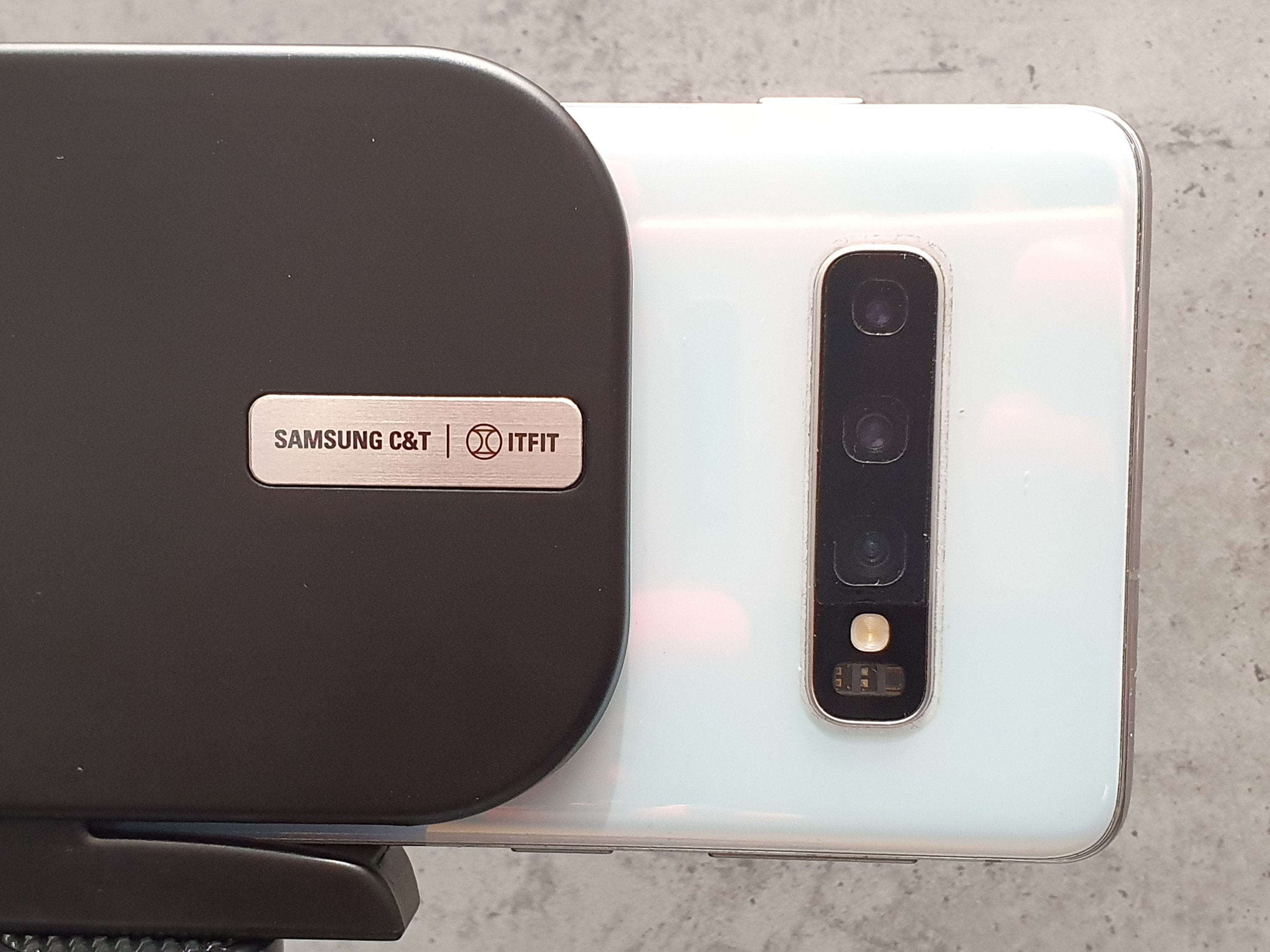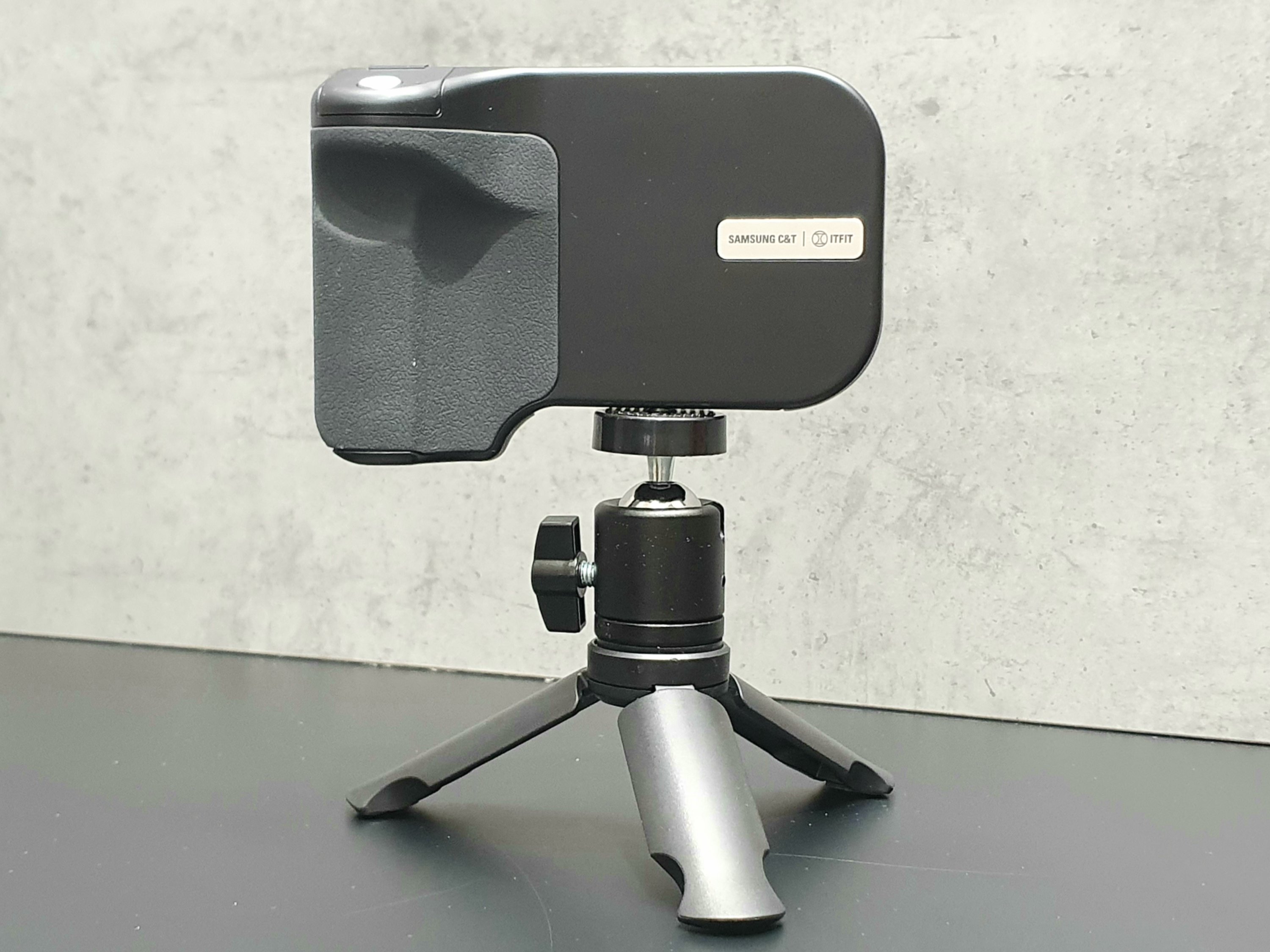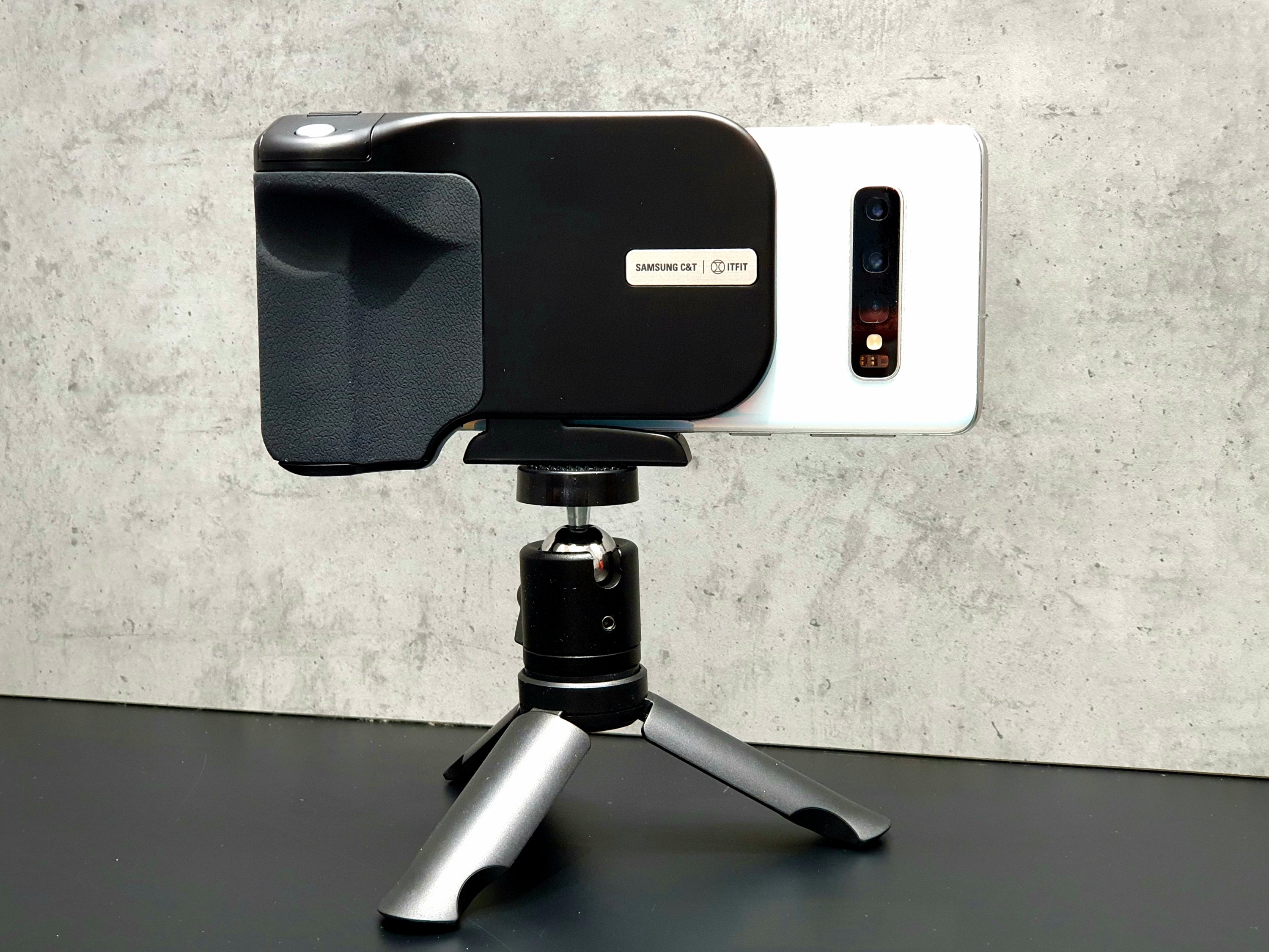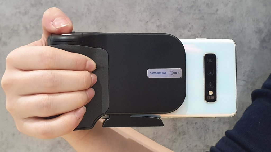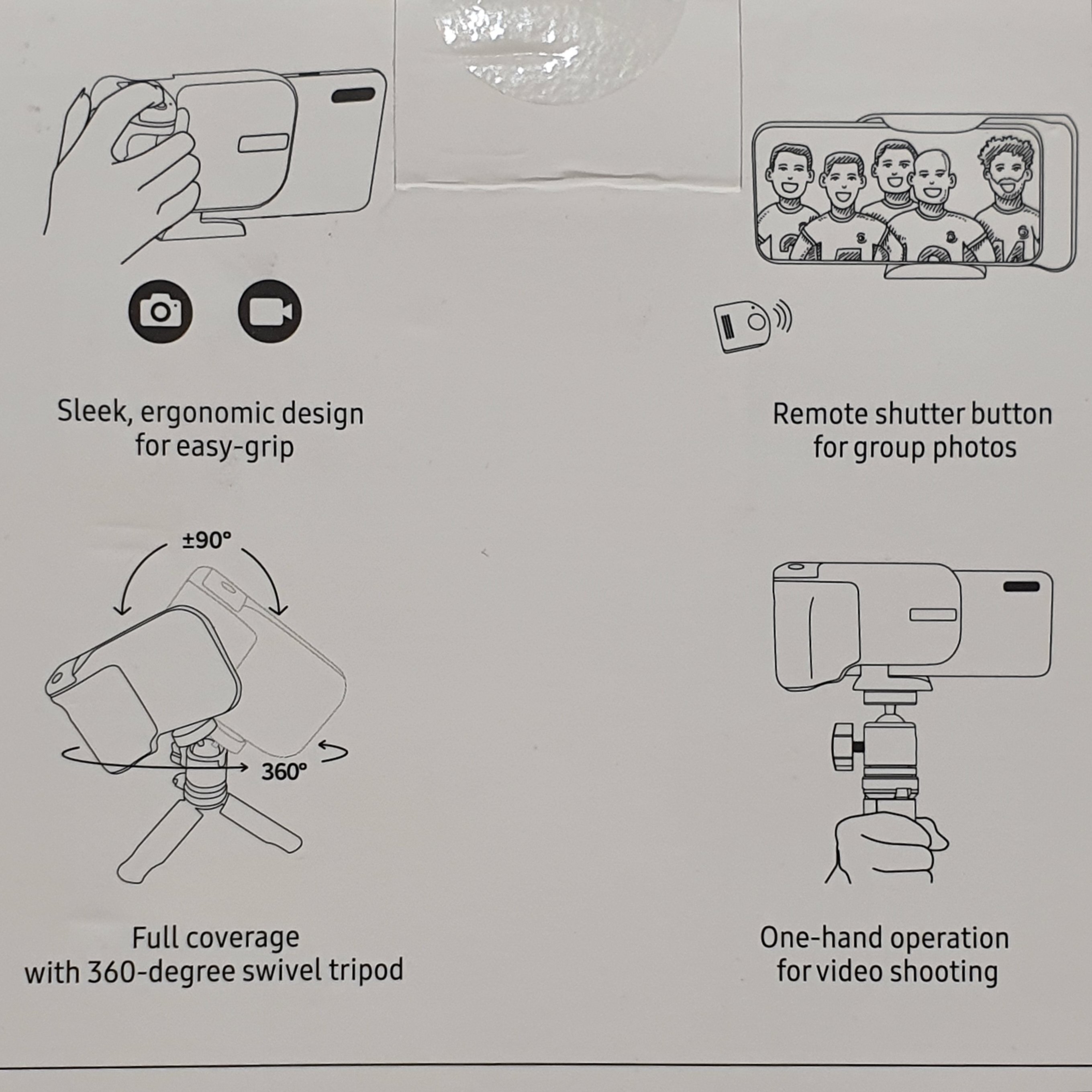 Első ránézésre adhatja magát a tény, hogy alanyunk kezében egy Galaxy S10-es készülék köszön vissza, amit egy markolatféleség fog közre. Ha csak ez utóbbit veszítek jobban szemügyre – és a telefont kitakarjátok a képről –, akkor akár még egy belépőszintű tükörreflexes gép markolatát is bele lehet képzelni a hölgy kezébe. Az alapkoncepciója a terméknek, hogy imitálja felhasználójának a fényképezőgép érzetet.