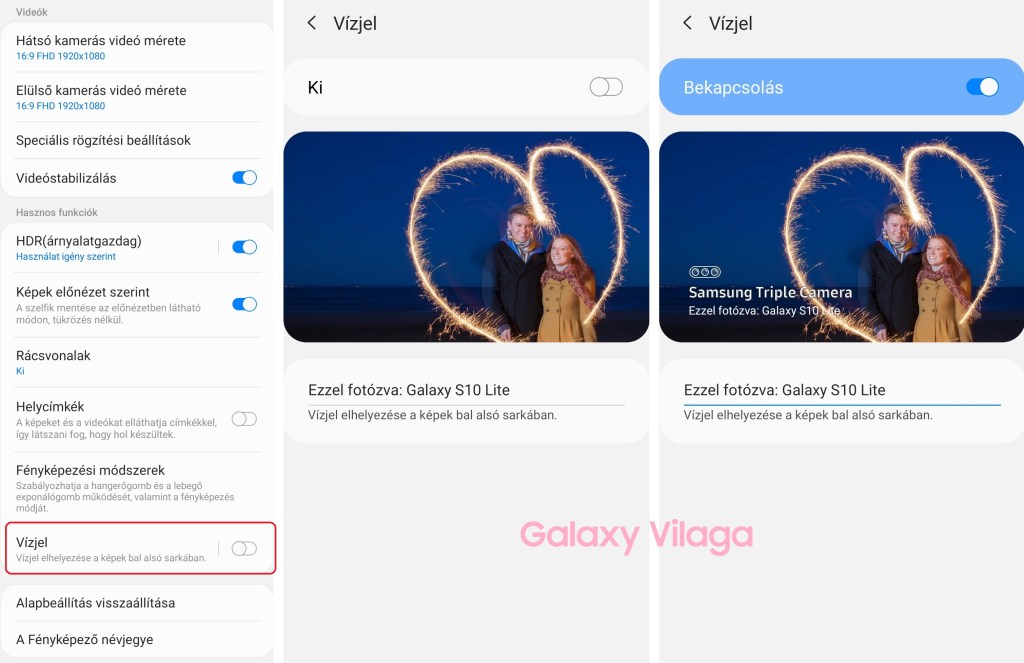 Tehát ugyanitt, mármint a kamera beállításainál találni fogsz egy „Vízjel” almenüt, amibe belépve tudod aktiválni a lehetőséget. Mutatnám fotó formájában a folyamatot: