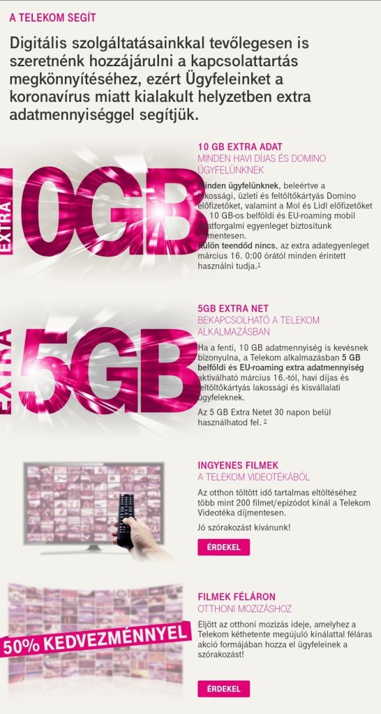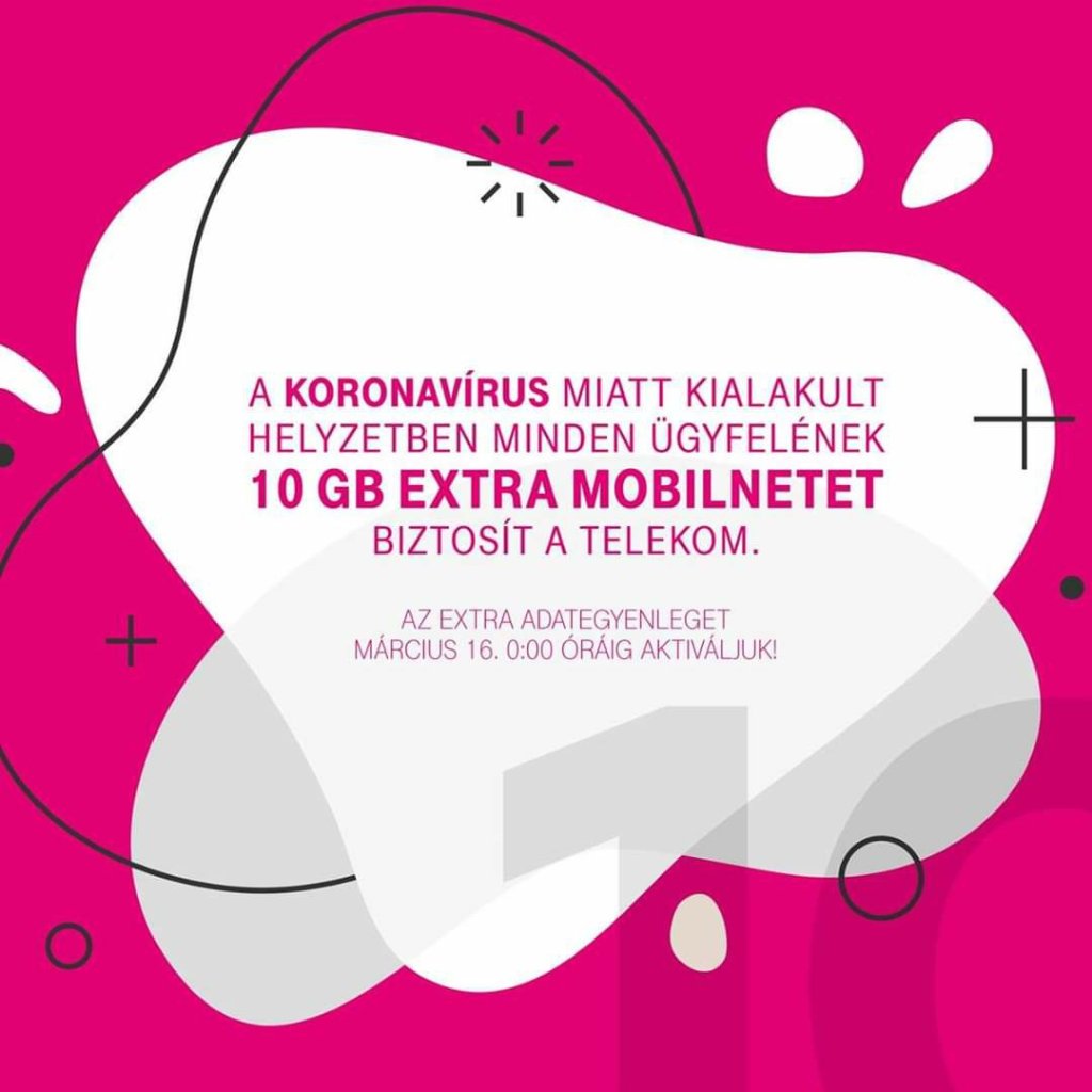 A Telekom a kialakult járványhelyzet kapcsán úgy határozott, hogy minden lakossági -, üzleti – és feltöltőkártyás ügyfelét 10GB ajándék mobilnettel meglepi, amit következő hónap végéig használható fel; illetve amit automatikusan aktiválnak mindenkinél legkésőbb március 16-ig.