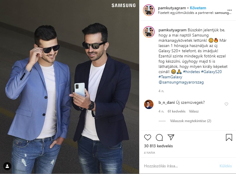Csak afféle off-topic cikként említeném meg, hogy az internet népe éppen azzal a hírrel van elfoglalva, hogy a Samsung Magyarország együttműködésbe kezdett Pamkutyával (vagy Pamkutyáékkal?). Májustól a nevükhez kapcsolódik a Galaxy S20+ készülék promózása, amit már gőzerővel el is kezdtek. Ha netán valaki nem lenne tisztában a márkanagykövetség fogalmával, akkor mindössze azt képzelje maga elé, hogy a nagyobb nézőbázissal rendelkező nagykövet/nagykövetek a márka termékeit használják és népszerűsítik csatornáikon.