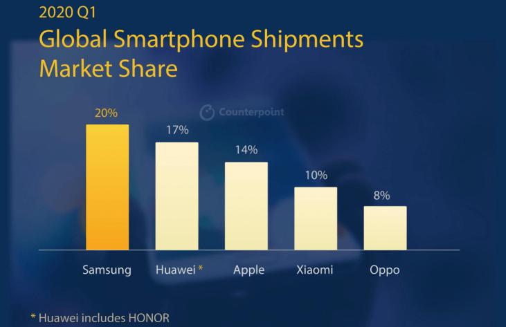 Nem olyan régen a Counterpoint Reseatch piackutatócég számolt be arról, hogy milyen piaci részesedést sikerült elérnie az okostelefongyártóknak globálisan az év első három hónapjában. A végeredményben ugyanaz született, mint az előzőknél, azaz a Samsung 20% körül uralja a piacot. Magyarra lefordítva minden 5 ember a Földön a Samsung mellett rakja le a voksát. A második helyen a Huawei zárt úgy, hogy a Honor családot is beleszámítják a 17%-os eredményébe. A dobogó legalsófokán az Apple foglalt helyet 14%-kal.
