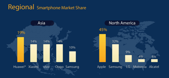Van azonban két olyan régió, ahol a Samsung alulmaradt; sőt az egyiknél épp hogy felfért a TOP5-be. Észak-Amerikában az Apple utasította maga mögé. Mondjuk érthető, hiszen az amerikaiak a saját terméküket előnyben preferálják. New York-ban pl.: nincs is a Samsungnak márkaboltja, míg az Apple-nek több. Ott 45%-kal foglalt trónt az almás brand, viszont nem sokkal lemaradva követte a dél-koreai, hiszen 32%-os teljesítménymutatója se csalódás. Külön érdekességképp említeném meg, hogy a 4-5. helyen a Motorola és az Alcatel tűnik fel, míg a kínai brandek sehol sincsenek.