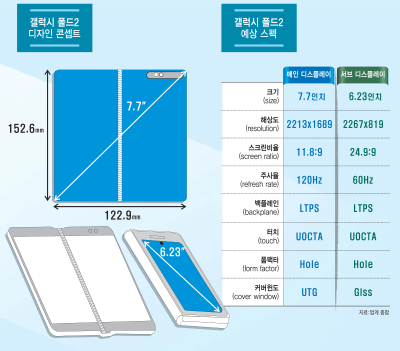 A Samsung megtartja a jól bevált formatervét, azaz lesz egy nagyobb belső kijelzőnk, illetve egy kisebb külső. Előbbinél 7.7 inchet emlegetnek, ami 0.4 inchcsel lenne nagyobb a Galaxy Fold-hoz képest, míg utóbbinál 6.23″-t, ami pedig 1.63″-lal garantálna méretesebb megjelenítő panelt. Nagyon úgy fest, hogy ezt a részt el lehet hinni, hiszen mi se tartjuk elképzelhetetlennek, hogy a külső oldalon megbújó panel, miért ne lehetne jelentősen nagyobb?! A kijelzővel nagyobb élményt szeretnének elhozni, ezáltal a már a Galaxy S20-szériánál bemutatkozott magasabb, 120Hz-es képfrissítéssel is lehet számolni – de csak a méretesebb belső felületnél, ahol egyelőre még nem tisztázott a kamerák száma, illetve annak kialakítása.