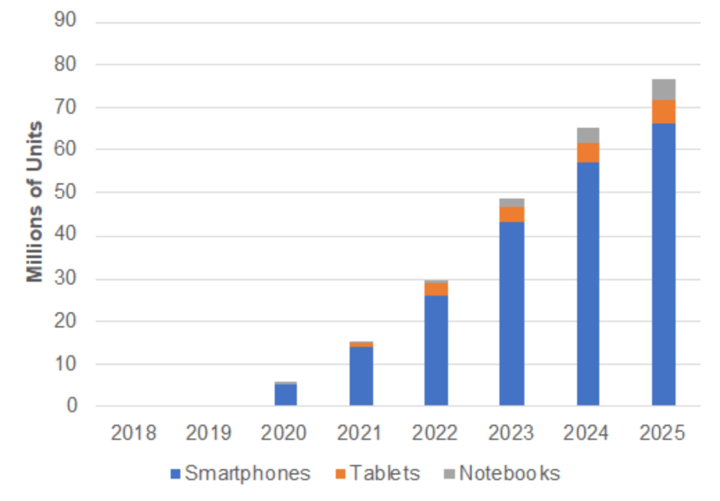 A Display Supply Chain Consultants piackutató szerint 2020-ban még a termékcsalád 100%-át az okostelefonok fogják kitenni, míg 2021 lehet az első olyan esztendő, amikor beállnak a sorba a tabletek, majd pedig 2022 az az év, amikor hozzájuk csatlakozik a notebook piacága. Persze ez csak spekuláció, változás jogát fenntartják, de nincs kizárva a jóslat beteljesedése sem. Gyártót persze nem említ, bár kíváncsiak lennénk, hogy az adott kategóriában, melyek álltak be a versenybe.