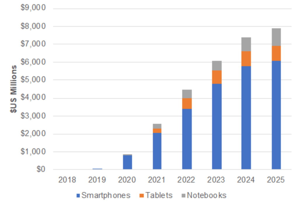 A másiknál már a lehetséges eladási bevétel kerül górcső alá, aminél maximum azt hangsúlyoznám ki, hogy az okostelefonok piacán várható a legnagyobb árbevétel – tehát ez a legfőbb piaci területe a technológiának. A tablet világa csekéllyel követi, azonban 2024-re várhatóan a notebook piaca utoléri, majd pedig túlhaladja 2025-re.