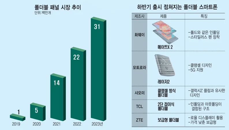 A múltkori Galaxy Fold 2 pletykás cikknél publikáltam egy fotót, amit az ETNews oldala tett közzé. Csak a felső részletét láthattátok, azonban most elhoznám az alsót – amit levágtam belőle –, melyben arról írnak, hogy miként változhat a termékcsaládban feltűnő termékek száma a következő 5 esztendőben. A jobboldali kimutatásnál a Huawei, a RazR, a Xiaomi, a TCL és a ZTE készülékeiről ír, melyek 2020 második felében debütálhatnak – már ha nem kerül porszem a gépezetbe és csúszik valami oknál fogva.