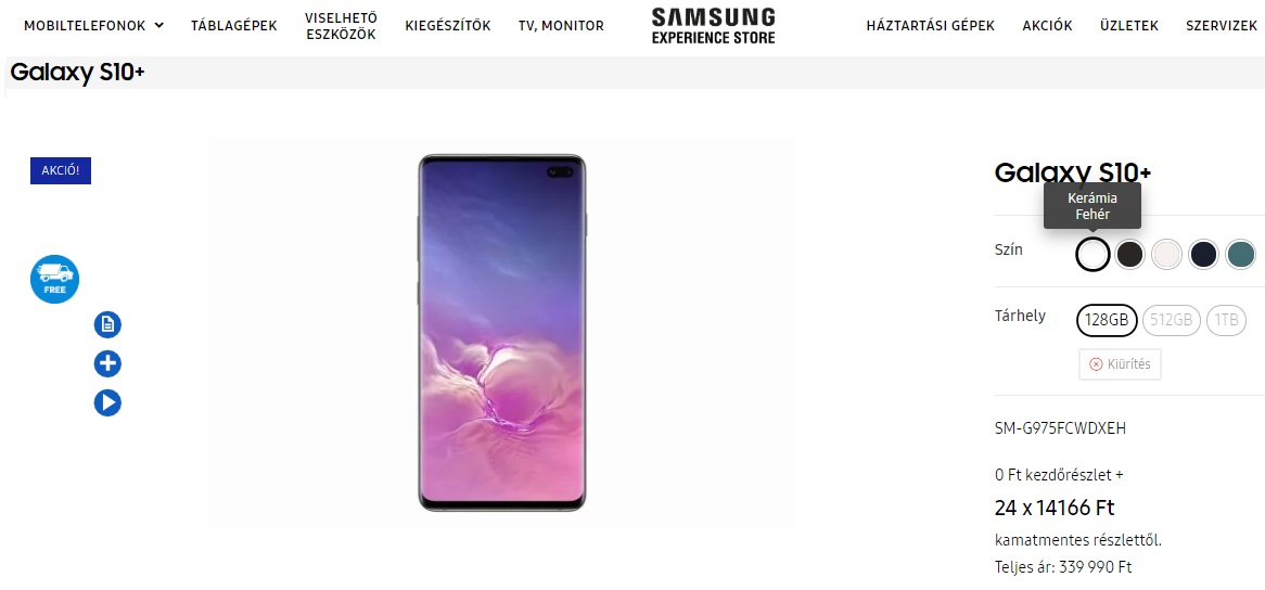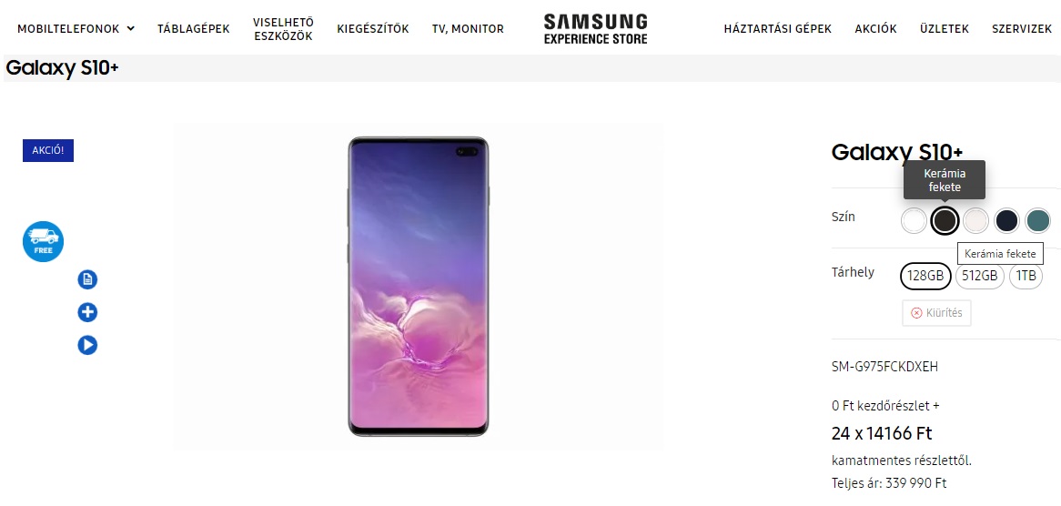 | Galaxy S10+ | 128GB | Kerámia fekete | SM-G975FCKDXEH | 339 990 Ft |