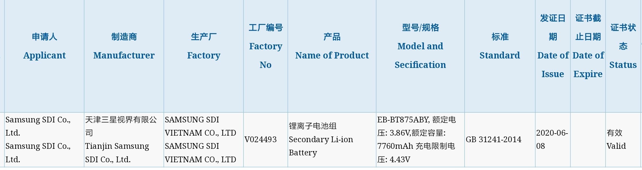 A szabadlom június 8-án került rögzítésre, melyben egy bizonyos ‘EB-BT875ABY’ típusszámmal ellátott akkumulátort emlegetnek 7.760mAh-ás mérettel. A jelenlegi teóriák alapján az SM-T875-ös modell lehet a SIM kártya képes Galaxy Tab S7, míg az SM-T975 pedig a Galaxy Tab S7+. A Samsung részéről persze nincs megerősítve, de sokak szerint helyén van az elképzelés.