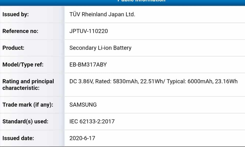 Az ‘EB-BM317ABY’ típusszámon futó alkatrész 5.830mAh-ás névleges akkumulátor mérettel rendelkezik, amiből arra lehet következtetni, hogy a tipikus mérete valószínűleg ugyanakkora lesz, mint az alapmodellnek, azaz 6.000mAh-s. Sőt, abból kiindulva, hogy az átlagosnál jelentősen nagyobb kapacitással rendelkezik, biztosan támogatják a 15 wattos töltési lehetőséget.