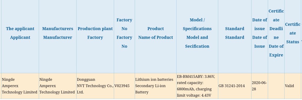 A berögzítés szerint, az ‘EB-BM415ABY’ típusszámra hallgató akkumulátor 6.800mAh névleges mérettel rendelkezik. Ilyen méretes aksitelepje a Samsung berkein belül okostelefonnak még sosem volt, maximum tabletnek. Fel is merülhet a keresztkérdés, hogy milyen vastagsággal szeretnék eladni a terméket, mert ennek már kell a hely a készülék vázában.