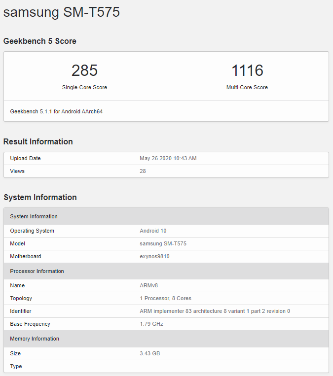 A Samsung nem veszi fél vállról a kínálatának szinten tartását. A 2019-es évben a tableteinél két-két terméket helyezett a portfóliójába – legalábbis Magyarországon. A középkategóriába érkezett: a Galaxy Tab A 8.0 (SM-T29x) és a Galaxy Tab A 10.1 (SM-T51x), míg a felsőkategóriába: a Galaxy Tab S5e (SM-T72x) és a Galaxy Tab S6 (SM-T86x). Idén se lesz másképp, hiszen már bemutatkozott a Galaxy Tab S6 Lite, illetve várjuk a Galaxy Tab S7-család leleplezését, viszont a közép éráról sem szeretne elfeledkezni. Egészen májusig kell visszamennünk az idővonalon, amikor a Geekbench oldalán feltűnt egy lehetséges utód ‘SM-T575’ típusszámmal. (Lásd: lentebbi prt sc-t.)