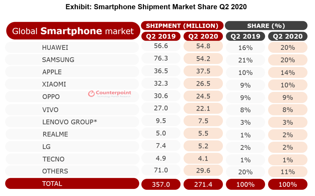 Tudni lehetett, hogy a COVID-19 járvány kihatással lesz az okostelefon piacára, hiszen az emberek többsége az ínséges időkben nem azt nézegeti, hogy mire költse el a meglévő vagyonát, hanem inkább, hogy miként vészelje át azt. Az első negyedévben jelentősen megtorpantak az eladási mutatók, és az elemzők jóslata is beigazolódott, hogy csak bizonyos régiókban kezdődhet meg az iparág újraindulása az időszak közepe tájt. Ezt a helyzetelőnyt használta ki tulajdonképpen a Huawei, ami mind a Canalys, mind a Counterpoint Research kimutatásai szerint a negyedév bajnoka lett, és felhozta magát a Samsung szintjére.