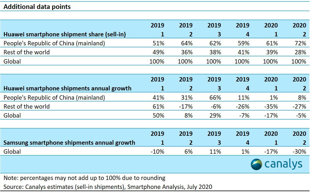 A Canalys kitér arra is, hogy 14%-os visszaesés mutatkozott a tavalyi azonos időszakhoz képest, amelynek legnagyobb szeletjét a Samsung ragadta ki, ami 30%-kal hozott kevesebbet. A legnagyobb piaca az okostelefonoknak egyértelműen Kínában található, ahol a Huawei 44%-os piaci részesedést szerzett, messze lenyomva az össze versenytársát. Az USA-ban az Apple tudta magát a trónon tartani. A harmadik legjelentősebb régió az indiai, ahol 17.3 millióval csökkent az mobil készülékek szállítása, ami majdnem közel 50%-os elmaradást vonz maga után.