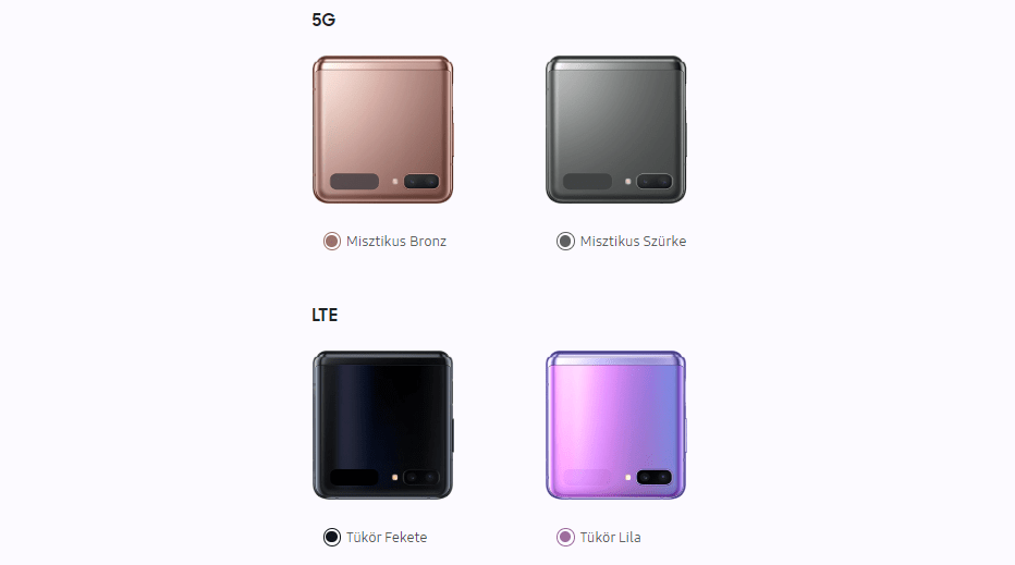 | Galaxy Z Flip 5G | SM-F707B | 579 990 Ft | Misztikus Szürke | Misztikus Bronz |