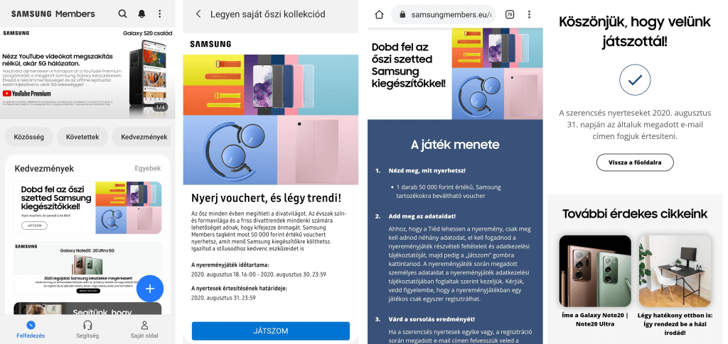 A nyereményjáték feltételetit mindenképpen ajánlom figyelmetekbe, mivel lesznek olyan fontos pontok (pl.: 4.5-ös), amikre oda kell figyelnetek a megnyert voucher felhasználásánál. Mint pl.: ilyen az, hogy a Samsung oldalán feltűntetett tartozékokra, illetve viselhető eszközeire váltható be, viszont az árengedmény JBL és Harman & Karmon típusú termékekre nem vonatkozik. Ezen kívül javasolt a teljes összeg elköltése, hiszen nem kártyáról van szó, amiről fokozatosan le lehet vonati a kedvezményt; hanem csak egyszeri felhasználásra jogosítja fel a tulajdonosát. Ha pedig kevesebbért vásárolnátok, akkor a fennmaradó összeg elveszik, ugyanis nem váltható készpénzre sem a teljes, sem a rajta maradt rész.