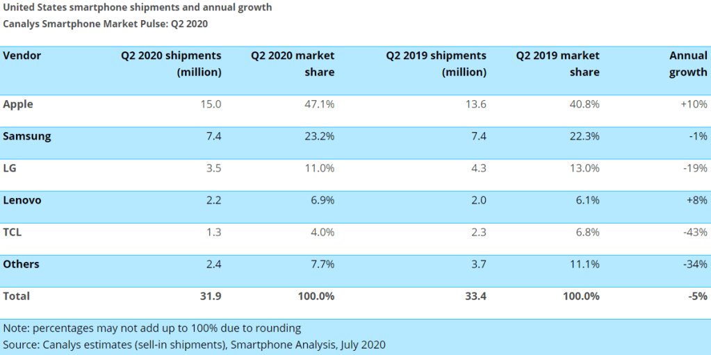 Kezdenék mindent azzal, hogy az USA-ban a TOP5 okostelefongyártók között nem foglal helyet se a Huawei, se a Xiaomi; ellenben az LG és a Lenovo ott van az Apple és a Samsung mögött, hogy megpróbálja elnyerni vásárlóikat. A leszállított készülékek száma a 2019-es azonos időszakhoz képest 5%-kal visszaesett, ami értékben kifejezve 31.9 milliónyi okostelefon jelentene három hónap leforgása alatt, míg korábban 33.4%-ot tudtak az asztalra letenni a gyártók.