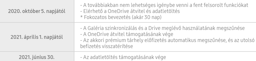 „2021. június 30. napjától kezdve, a Galéria szinkronizálás és a Drive tárhely a Saját fájlokhoz már nem kap Samsung Cloud támogatást, és az Ön adatai törlésre kerülnek, az alábbiakban ismertettek szerint. Emellett, ha prémium tárhely előfizetési programja van, ez is automatikusan törlésre kerül 2021-04-01 napjától, és a díjat visszatéríthetjük Önnek.