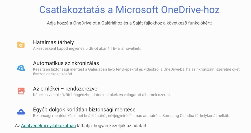 Ezeket a funkciókat mostantól a Microsoft OneDrive támogatja (Előfordulhat, hogy ehhez nem jár támogatás bizonyos országokban vagy eszközmodellek esetén). Az esetlegesen felmerülő kényelmetlenségek minimalizálása érdekében lehetőséget biztosítunk Önnek arra, hogy meglévő Galéria szinkronizálás és/vagy Drive adatait kényelmesen átvigye a OneDrive-ra és továbbra is igénybe vegye a szolgáltatást, vagy pedig letöltse az adatait a mobileszközére és/vagy PC-jére. Kérjük, vegye figyelembe, hogy ha átviszi vagy letölti az adatait, ezek a funkciók megszűnhetnek és az adatai idő előtt törlésre kerülhetnek, még a hivatalos végdátum előtt, az alábbiakban leírtak szerint.