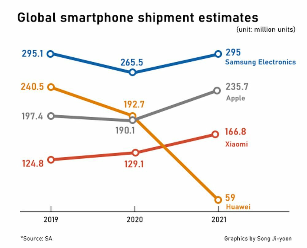 Song Ji-yoon által kreált grafikon azt szemlélteti, hogy 2021-re a Samsung ugyanott lesz, mint anno 2019-ben, csak éppen több tapasztalattal; illetve azt, hogy átpozíciónálódik a lista a Samsung mögött, amelynek egyik legnagyobb nyertese a Xiaomi lehet.
