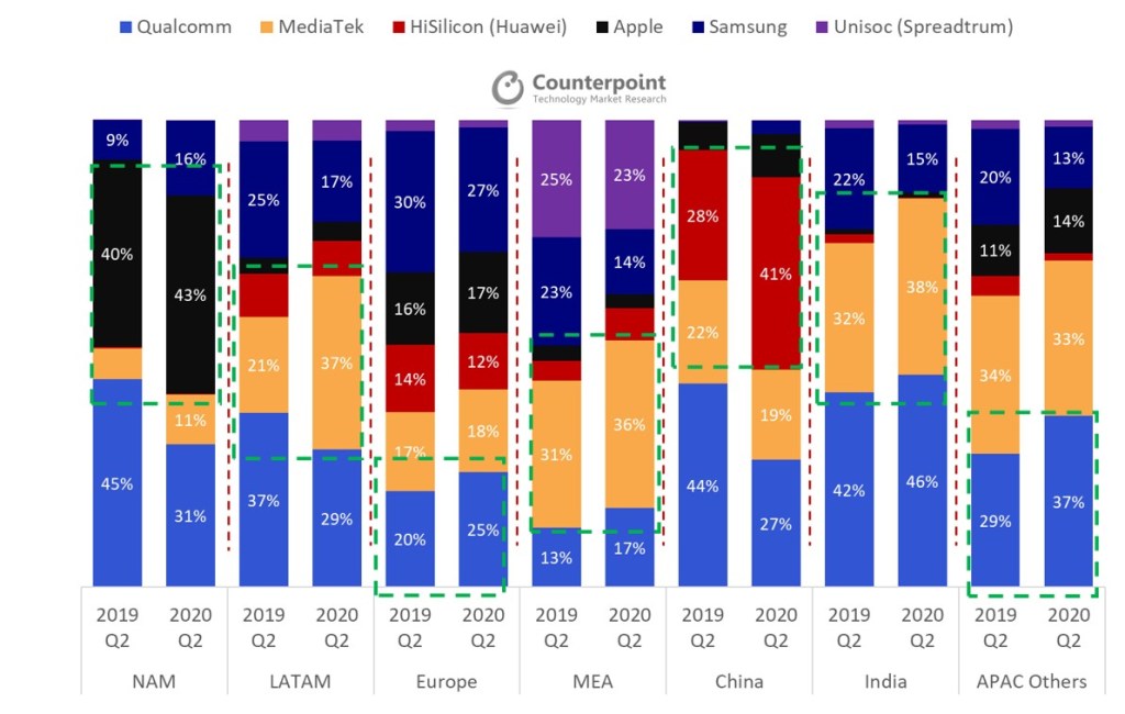 Mint az a kördiagramról leolvasható, a MediaTek gyártó eléggé megközelítette a Qualcomm-ot. A harmadik helyre a HiSilicon állhatott fel, akik a Kirin processzorlapkákért felelősek, viszont az elemzőcég szerint csökkenés várható a harmadik negyedévben részükre, hiszen az amerikai szankció nehezíti a létezésüket és a Huawei eladásait. Szabályosan látszik az átrendeződés, ugyanis míg 2019/Q2-ben a dobogó legalsófokára a Samsung állhatott fel az Exynos-családjával, addig egy évvel később a vírus tetőzéséből való gyors kilábalásnak köszönhetően, illetve az importok megfogásával megerősödött a Hisilicon. 2020/Q2-ben a dél-koreai vállalat lapkája ugyanúgy fogyott, mint az Apple-é; mind a kettő 13%-on zárta az időszakot