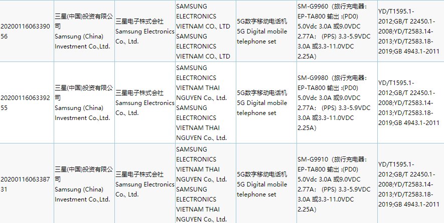 Nem sokkal később, egy érdekesség tűnt fel az interneten, ugyanis a megszokott hatóságnál berögzítésre került a Galaxy S21-családnak a töltőadaptere. A húzás szinte olyan, mint ha direkt erre a pillanatra időzítettek volna, ettől függetlenül lelepleződött, hogy mind a három termékhez ugyanazt a töltőt fogja a gyártó a készülék mellé csomagolni. Nem tesznek különbséget egyik-másik között. Mutatnám a 3C minősítésének sorait: