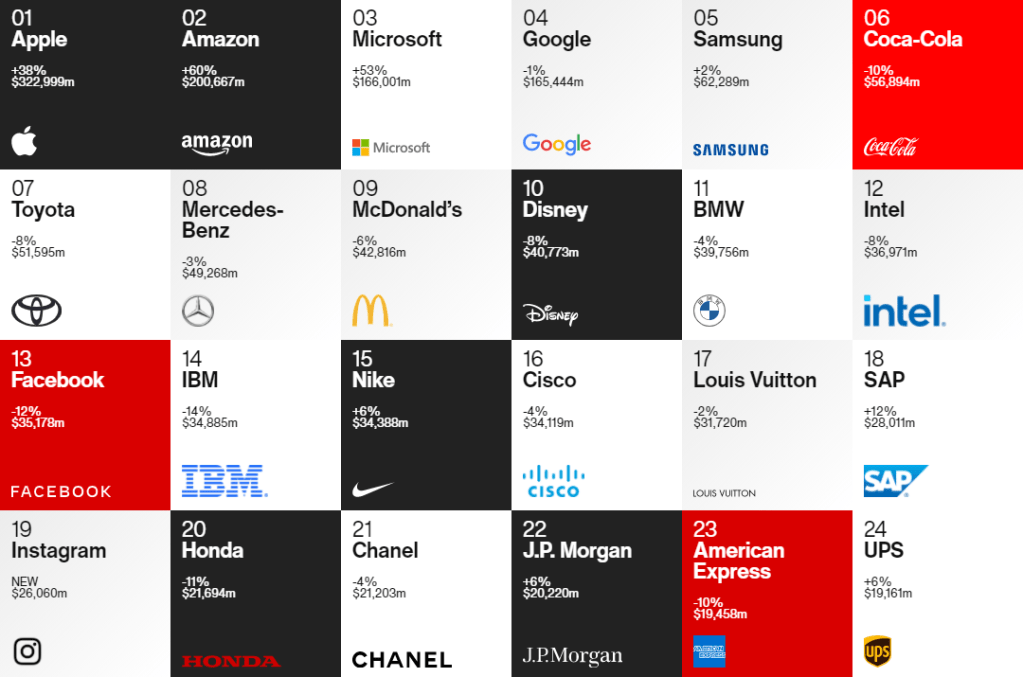 | Márkaérték (USD) | 19.5B | 23.4B (20%↑) | 32.9B (40%↑) | 39.6B (20%↑) | 45.5B (15%↑) | 45.3B (-) | 51.8B (14%↑) | 56.2B (9%↑) | 59.9B (6.5%↑) | 61.1B (2%↑) | 62.3B (2%↑) |