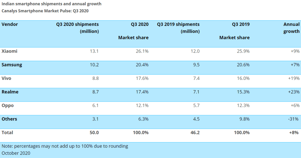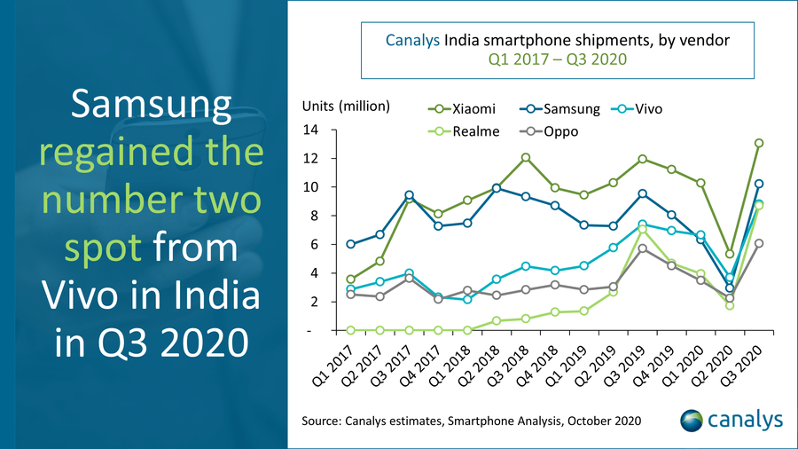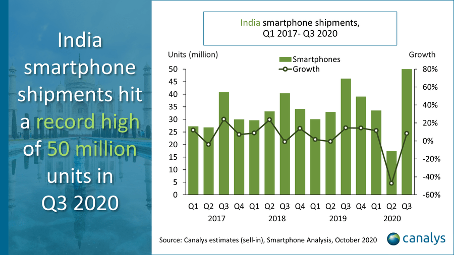„Az okostelefon-gyártók határozottan jól teljesítettek. A kormány lassan, de biztosan csökkentve a mozgáskorlátozásokat egy három hónapos lezárás után, tökéletes légkört teremtett a tartós növekedéshez. Míg szinte az összes eladó pozitív szállítmány-növekedést mutat, az igazi nyertesek az online csatornák, akiket az ünnepi szezon előtt hatalmas készlettel láttak el. Az Amazon és a Flipkart folyamatos értékesítése egyértelműen jelzi, hogy a gazdasági visszaesés ellenére India hajlandóságot mutat a jó okostelefonra és a jó ajánlatokra.”