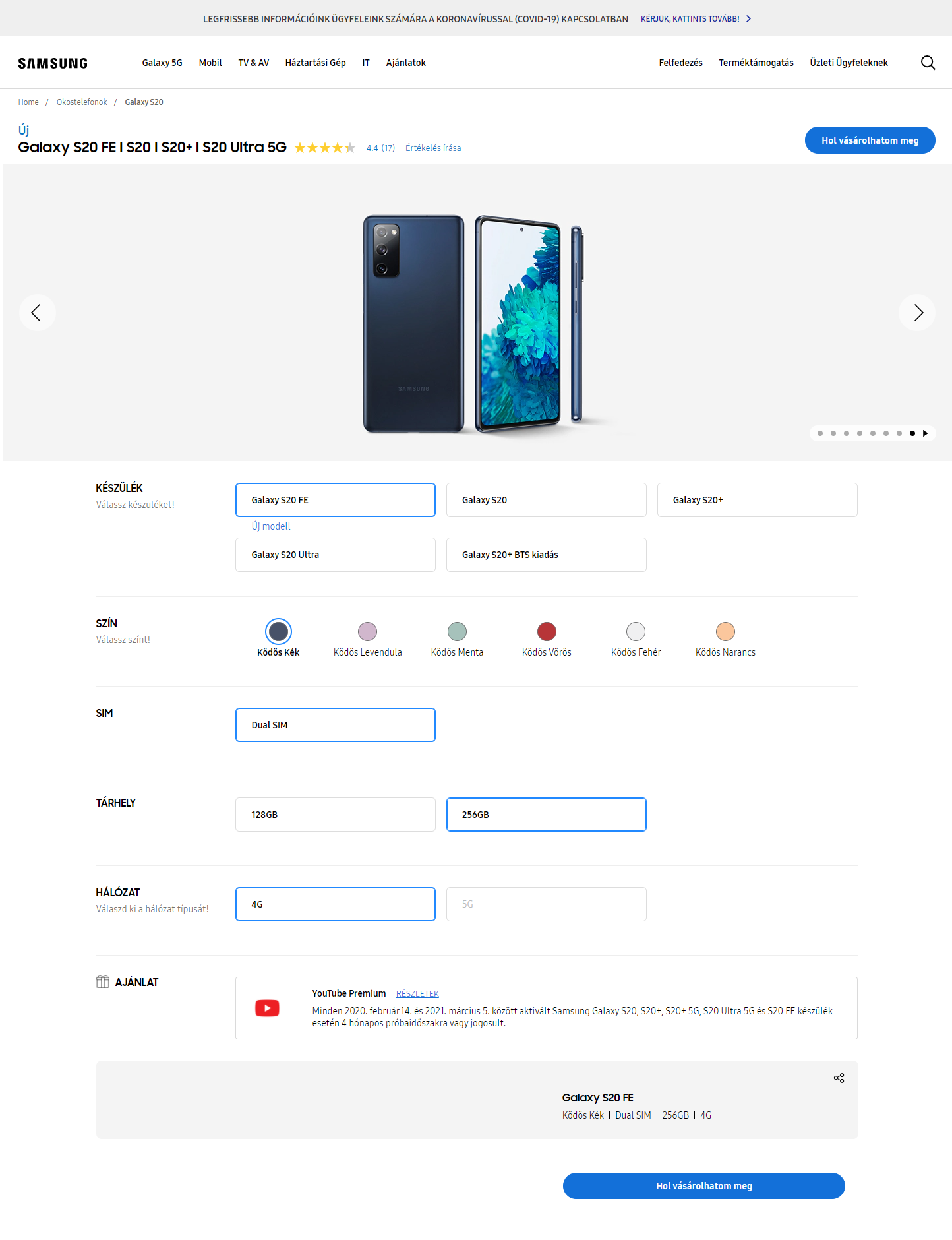 Aki olvasni szokta a külföldi képviseletek oldalait, az tudhatja, hogy tegnap startolt el a Galaxy S20 FE 5G 256GB-os változatának értékesítése az Egyesült Államokban. Talán ezen jelenségre vezethető vissza az a baki, amivel csütörtök óta szembesülhetnek a magyar látogatók, miszerint frissítésre került a termék aloldala. Hamar utánajártunk, hogy valóban kapható lesz-e az 5G-s variáns (mondjuk valamelyik szolgáltatónál, ami képes a gigabites netre?!), azonban csak egy hiba folytán történt kiírásra, amelynek helyesbítésén már munkálkodik a weboldal karbantartó csapata. Ezzel egyidejűleg megfigyelhető, hogy a 256GB-os ROM opció is feltűnik a ROM választékban, ami már egy fokkal érdekesebb jelenség!