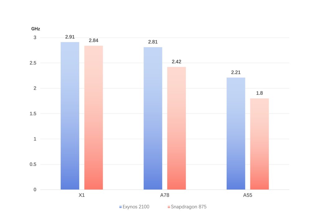 Noha, a lapkakészlet még bemutatásra vár, azonban Ice Universe információi szerint az Exynos ismét előnyre tehet szert. Ha csak a processzorklaszterekre helyezzük a hangsúlyt, illetve nem vesszük figyelembe az előzetes (esetlegesen visszafogott és korai) benchmark teszteket, akkor az előnye már érezhető, hiszen sokkal másabb GHz-tartományokban mozog, mint a versenytársa, a Snapdragon 875.