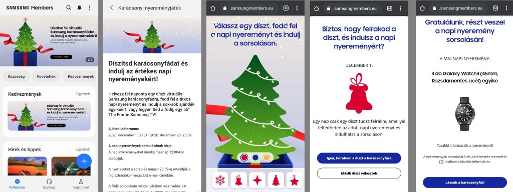 Felemás évet zárunk! Bátran ki merem jelenteni, hogy az idei karácsony másabb lesz; viszont a Samsung hazai képviselete próbálja feldobni különféle ajándéksorsolásokkal, mint ahogy azt tette tavaly is az Adventi időszakban. Most sem lesz másképpen, hiszen arra ösztönzi a felhasználóit, hogy közösen díszítsék fel a virtuális karacsonyfájukat. Minden nap van lehetőség egy új dísz felhelyezésére, amelynél nem csak a díszt, hanem annak színét is tudjátok változtatni hangulatotokhoz mérten. Ezzel párhuzamosan pedig a napi ajándékokért szállhattok harcba. A nagyobb durranásokat hétvégékre fogják ütemezni, de azért hétköznap is lesz miért harcba szállni.