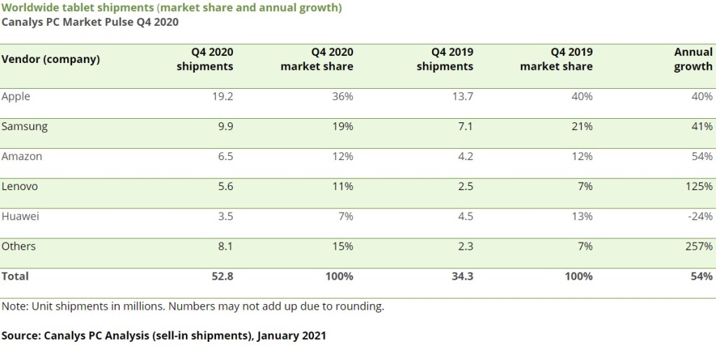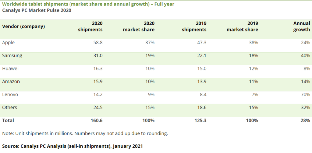 Mint említettem, 160.6 millió darab tablet került értékesítésre 2020-ban, ami 2019-hez képest 28%-os növekedés, amikor csak 125.3 millió talált gazdára. Ennek a summáját az Apple tudhatja magáénak, hiszen 58.8 millióval vezeti a listát. A Samsungra sem lehet panasz, hiszen tavalyelőtthöz mérve 40%-kal több készüléket sikerült eladniuk, így cirka 9 millió plusszal büszkén kihúzhatják magukat. A dobogó harmadik fokára a Huawei állhatott fel, ami a legalacsonyabb eltérést tudja felmutatni.