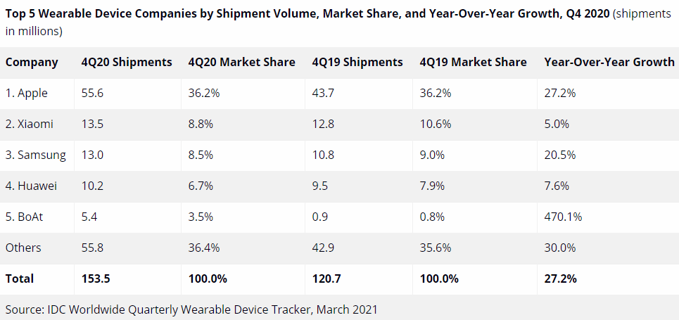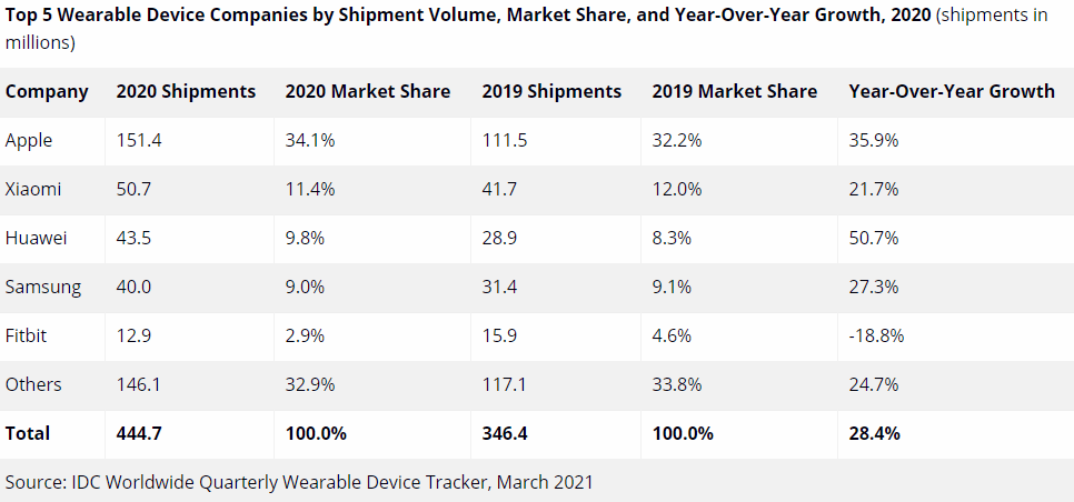 Ha a totál 2020-as évet vesszük górcső alá, akkor leszorult a dobogóról a dél-koreai vállalat, amit a Huawei, a Xiaomi és az Apple utasított maga mögé. 2019-hez képest a Fitbit jelentősen visszaesett. A Samsung 31.4 milliós tavalyelőtti mutatóját 40 millióra tornászta fel, mellyel éves viszonylatban 27.3%-os emelkedéssel mutatkozhatott a negyedik helyen.