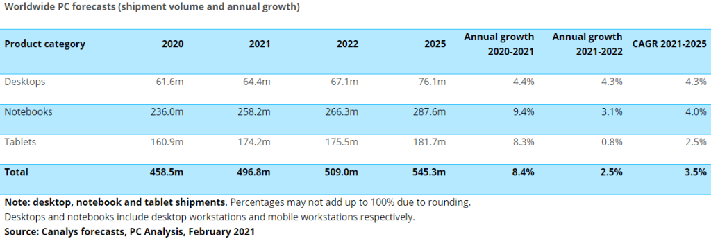 „A 2020-as fellendülés nyomán a globális PC iparág az elkövetkezendő években is növekedni fog. A megrendelések lemaradása és a folyamatosan jelenlévő kereslet nagyszerű rövidtávú lehetőséget kínál (…) De a Canalys viszonylag konzervatív álláspontot képvisel, egyszámjegyű növekedést vetít előre az idei és a következő évre a kínálat és az elosztás körüli bizonytalanság miatt. (…) A logisztika és a szállítás szintén korlátozó tényező a kereslet kielégítésében, az eladók drágább légi árufuvarozáshoz fordulnak a szállítási idő csökkentése érdekében.”