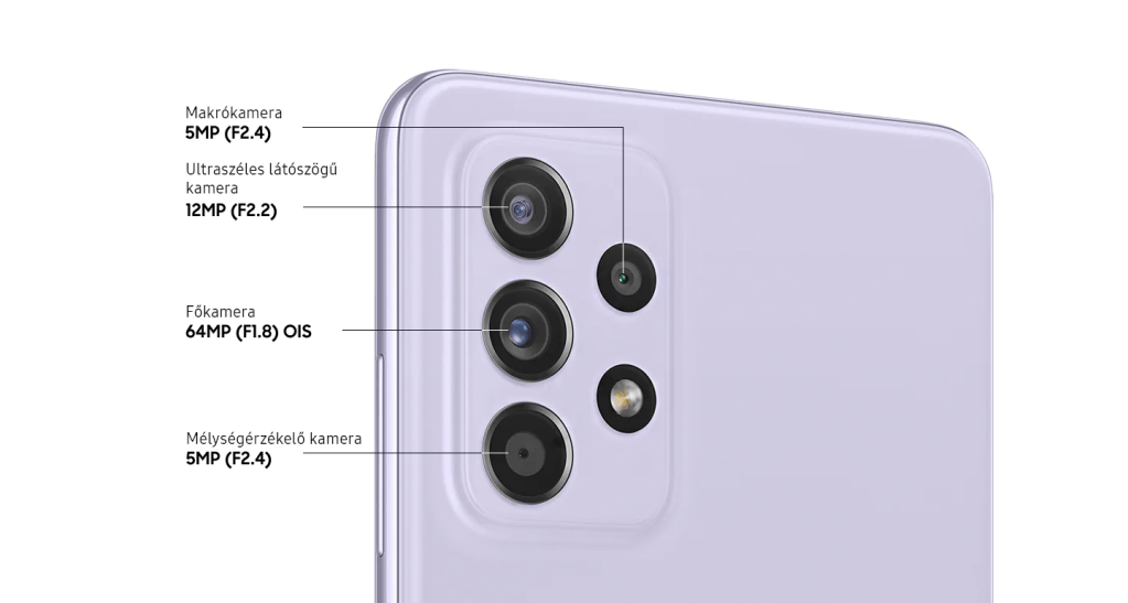 Hátlapon egy kamerasziget „türemkedik ki”, amin helyet foglaló főszenzor 64MP-es lett. Álljunk is meg, ugyanis az f1.8-as érték és az autófókusz mellé megkapta az optikai képstabilizátort, ami gondoskodik a remegések kikompenzálásáról. A többi érzékelőnél nincs variálás, ugyanis a mélységkamera és a makro ugyanúgy 5MP-en, fixfókusszal, 2.4-es fényértékkel készíti a fotókat; mint ahogy az ultraszéles is 12MP-en 2.2-es értékkel. Utóbbinál megtartották a 123°-os látótér befogást. A főérzékelő használatánál a 10x-es digitális zoomot se feledjük el, amivel a távolabbi témák hozhatók közelebb. A szelfikamerája maradt 32MP-es f2.2-es. Természetesen támogatja a 4K felbontást, így bátran lehet vele jó minőségű live streameket nyomatni.