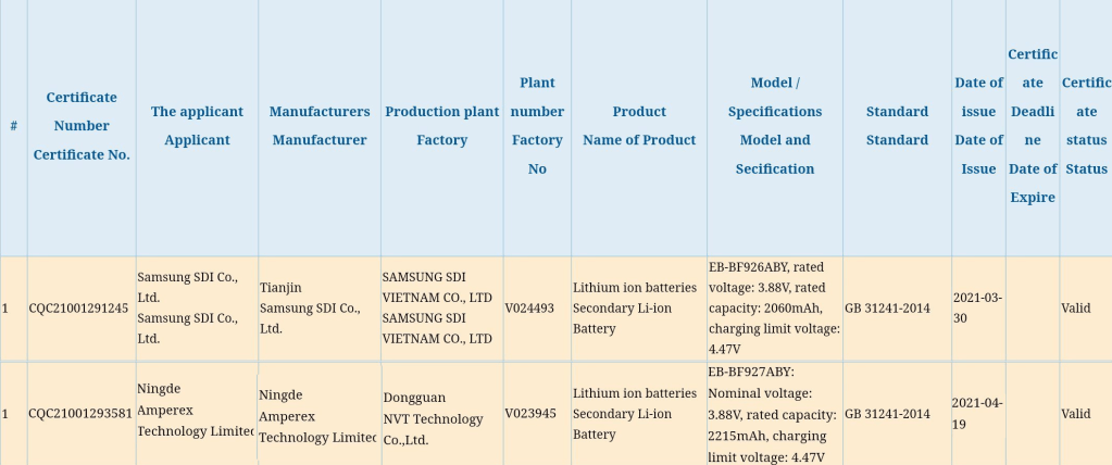 Mint az leolvasható, a nagyobb akkumulátortelep (EP-BF927ABY) 2.215mAh-s mérettel; míg a kisebb (EB-BF926ABY) 2.060mAh-ssal rendelkezik. Valószínűsíthető, hogy a kameraszigettel egységben lévő részre helyeződik utóbbi, hogy a kameraszenzorok elférjenek. Ha mindezt összegezzük, akkor kijön 4.275mAh-ás akkutelep, ami egy eléggé fura szám, így bátran lehet arra következtetni, hogy ez a kapacitás papírra fektetve valahol 4.380mAh és 4.400mAh közé kerülhet. Mellesleg, előbbi nagysággal a Galaxy Fold rendelkezett, ezért gondolnánk, hogy a netes teóriák között helytálló lehet ez az álláspont.