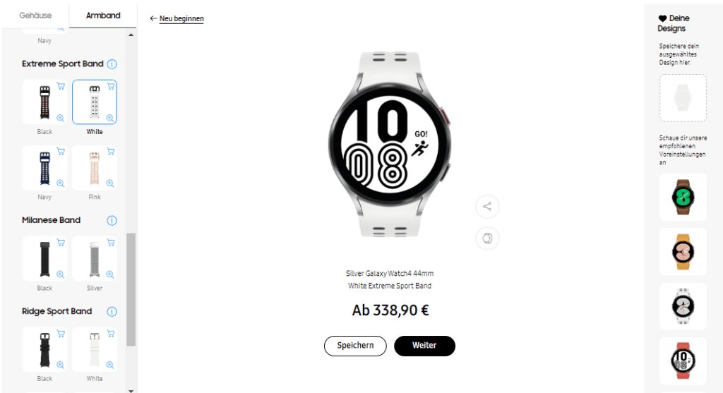 Az alapelképzelés pofonegyszerű: miután kiválasztod a hozzád legközelebb álló óravázat, dönthetsz a szíj kilétéről is. Előbbinél nincs újdonságok, ugyanazok a színek és méretek köszönnek vissza, mint ha bemennétek bármelyik viszonteladóhoz; utóbbinál azonban már felelhetők olyan óraszíjak, amelyeket csak külön vásárolva tudnátok az órátokhoz alkalmazni.