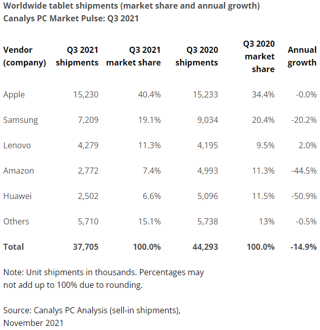 A Canalys piackutatócég elkészítette a szokásos negyedéves kimutatását, amely megerősíti, hogy visszaesőben a tabletek iránti érdeklődés. Ha a 2020-as azonos időszakhoz viszonyítjuk az eladási adatokat, akkor 14,9%-os visszaesésről számolhatunk be, ami azért hatalmas, mivel cirka 6 millióval múlta alul magát.