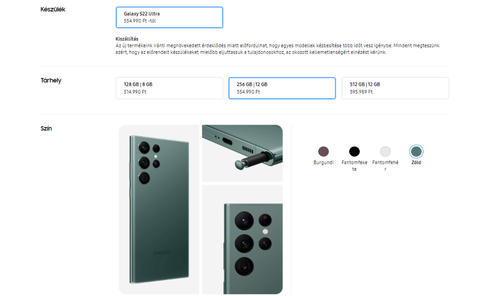 A Samsung.com webáruházáról érdemes tudni, hogy olyan termékek és bizonyos termékeknek a színei is kaphatók, amelyek más (kereskedelmi) csatornákon (pl.: Euronics, Media Markt, stb.) nincsenek jelen. Ha visszaemlékeztek a Galaxy Z Flip3 5G-re, akkor derenghet, hogy a Szürke, a Fehér és a Világos rózsaszín exkluzív színe volt, felár nélkül lehet(ett) rendelni. Igaz, nincs külön kihangsúlyozva, hogy a zöld az lenne a Galaxy S22 Ultra 5G eseténél, viszont ott a webáruház ajánlatai között – és árban ugyanannyit kérnek érte, mint a másik három színért.