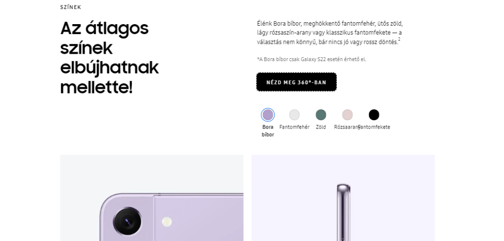„Pasztell és semleges tónusaival a Bora Purple az optimizmust és a nyugalom érzését testesíti meg. A választás erejével kibontakozik a világ. Akár a K-Pop sztár vagy, akár élethosszig tartó lila szerelmese, neked találtuk i a Galaxy S22 Bora Purple-t.”