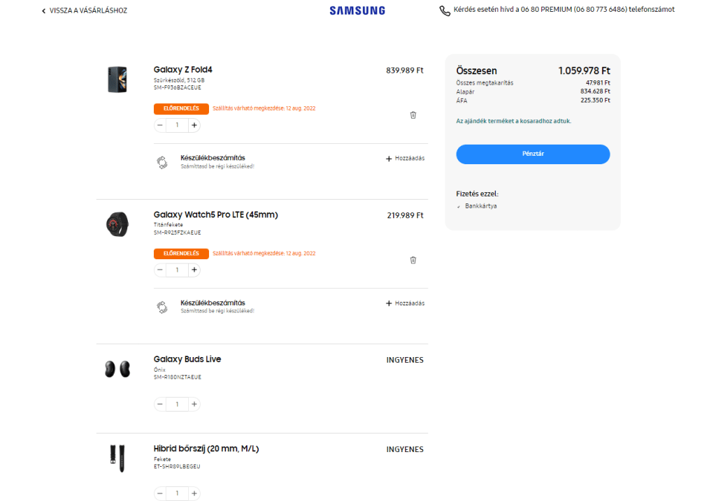 - A termékek kiszállítása már 2022. augusztus 12-én elstartol, azaz biztosan nem kell megvárnod az előrendelési időszak lezárulását. (Egyébként vélhetően, a Samsung márkaboltok is átveszik ezt, illetve egyéb partnerek is.)