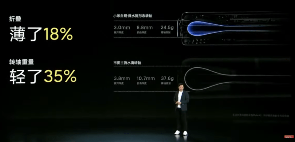 Ezzel szemben a Xiaomi, a Huawei és az Oppo új technológiával lépet a piacra, amit csak szlengesen „vízcsepp csuklópánt-megoldásként” emlegetnek. Az elképzelés lehetővé teszi, hogy a képernyő hajlítási területe összehajtva belesüllyedjen a telefon testébe, így afféle vízcsepp formát prezentálva. A vízcsepp zsanéros megoldás előnyei között szerepel, hogy összecsukott állapotban a hézag mértéke jelentősen kisebb, mellyel a fogyasztók elégedettebbek, hiszen veszít a vastagságából a termék.