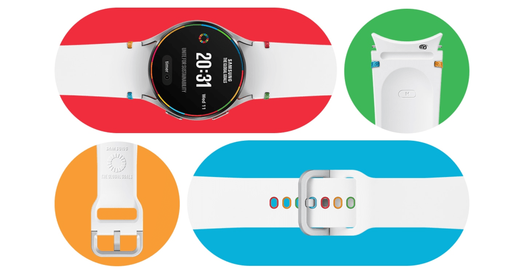 Az augusztusi Unpacked eseményt követően a Samsung piacra dobta a Global Goals kezdeményéhez kapcsolódó első kiegészítőjét, ami a Galaxy Watch4 és a Galaxy Watch5 termékcsaládokkal lesz kompatibilis. A szóban forgó termék valójában egy szíj, méghozzá egy fehér szilikon jellegű, melynek lyukai a szivárvány, vagy éppen a GG színeiben pompáznak.