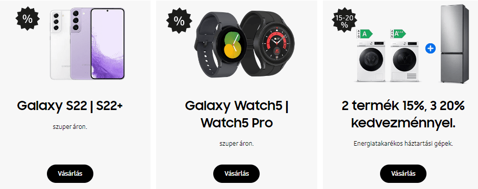 Kezdésképpen megemlíteném, hogy a Galaxy S22 termékcsaládra az év végéig tart egy úgy nevezett készülék beszámításos promóció. Ha a három modell közül választanál, akkor mindenképp élj a lehetőséggel, ugyanis azon felül, hogy x forintért átveszik a régi kütyüdet, még kapsz mellé ráadás kedvezményt, amit egyből a pénztárnál mutatkozni fog. A Galaxy S22 és a Galaxy S22+ egy kalap alá van véve, ami érhető, hiszen a weboldalon is együtt értékesítik, míg a Galaxy S22 Ultra-nak külön aloldalt kreáltak.