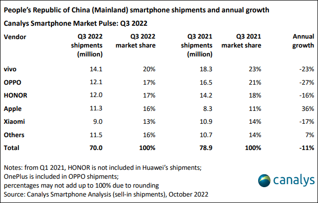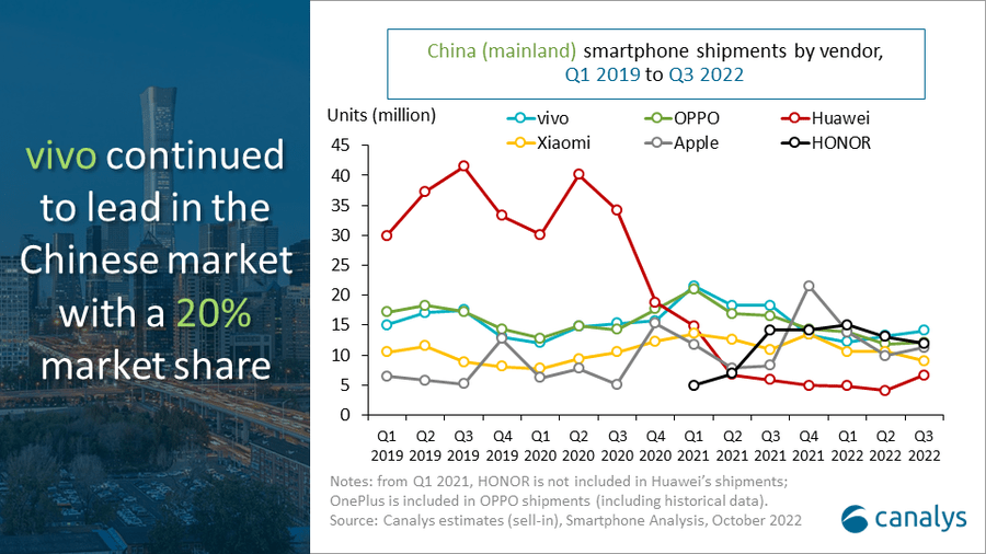 Kezdjük a feketelevessel. Nem csak globálisan, hanem Kínában is mutatkozott egyfajta visszaesés az 2021-hez képest. Míg tavaly a harmadik negyedévben 78.9 millió okostelefon került leszállításra, addig idén az azonos időszakban mindössze 70 millió. Ez 11%-os visszaesés, amit a gazdaság megérez. A megfigyelt régióban 2022-es évben a Vivo és az Oppo tudott megújulni azáltal, hogy rendezték a készletgondjaikat. Ki is fizetődött a stratégiájuk, ugyanis a dobogó legfelső fokait foglalhatják el, még ha 23-27%-os csökkenés mutatkozik.