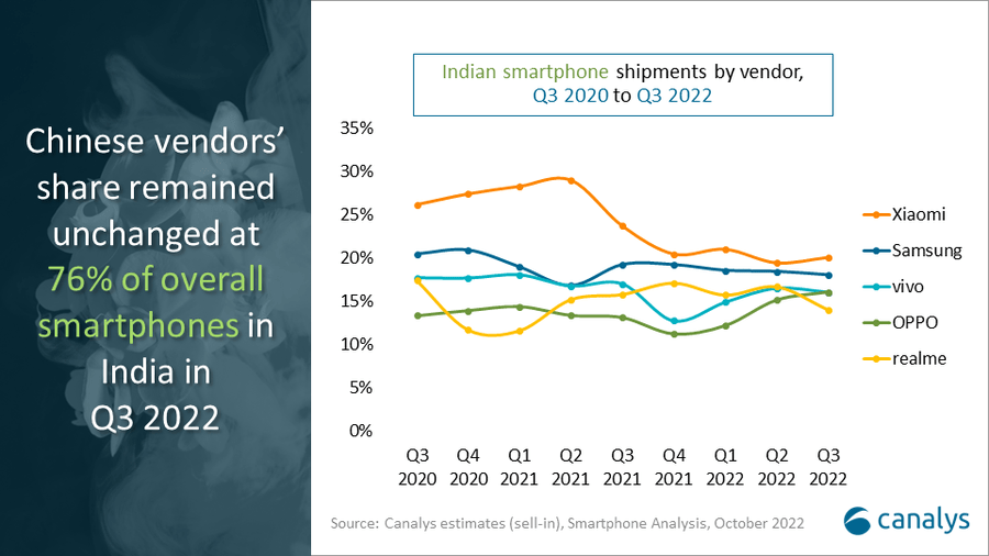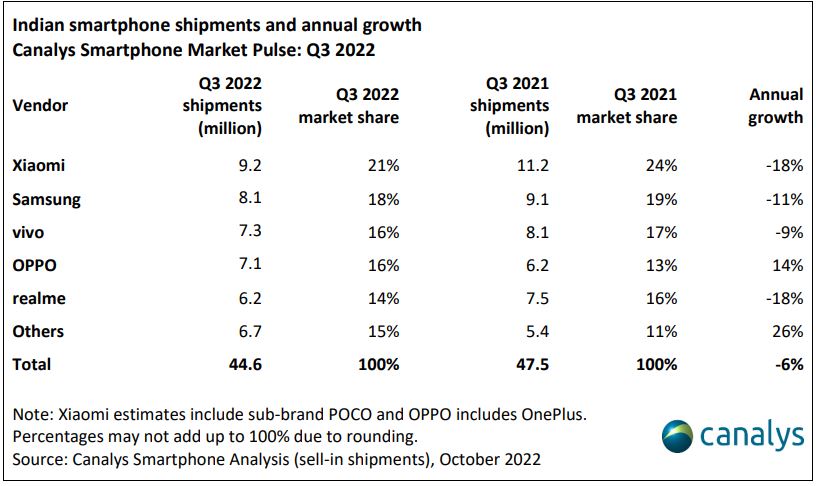 Ha a második negyedévhez hasonlítjuk a leszállítási rátát, akkor 6%-os visszaesést tud felmutatni az okostelefonpiaca. A dobogó legfelsőfokán a Xiaomi, ami alapvetően piacvezetői pozícióba foglal helyet a régióban. Noha már 30%-os piaci részesedést nem tud felmutatni, de a stabil 20%-ot hozza negyedévente. A Samsung ezzel szemben csak 8-9% körül teljesít, de még mindig elegendő ahhoz, hogy befoglalja a második helyet. 1.1 millióval maradt el a versenytársától, ami jelentős; viszont mentségükre szóljon, hogy kisebb visszaesési mutató jellemezte 2021 Q3-hoz képest, mivel csak 11% lett a végelszámolásnál.