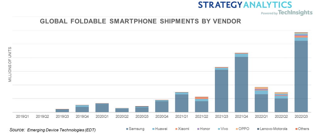 A Strategy Analytics készítette el a 2022-es harmadik negyedévére fókuszáló kimutatását. Természetesen a Galaxy Z Fold4 5G és a Galaxy Z Flip4 5G kapja a fókuszt, mégis csak velük robbant meg az időszak foldable eladása. A Samsung remek kampányokkal ösztönözte a felhasználókat, hogy váltsanak a jövő készülékeire; köztük a készülék beszámításos, vagy éppen a különféle bundle ajándékos promóciókkal. A végeredményt az alább látható grafikonnal remekül szemléltetni lehet: